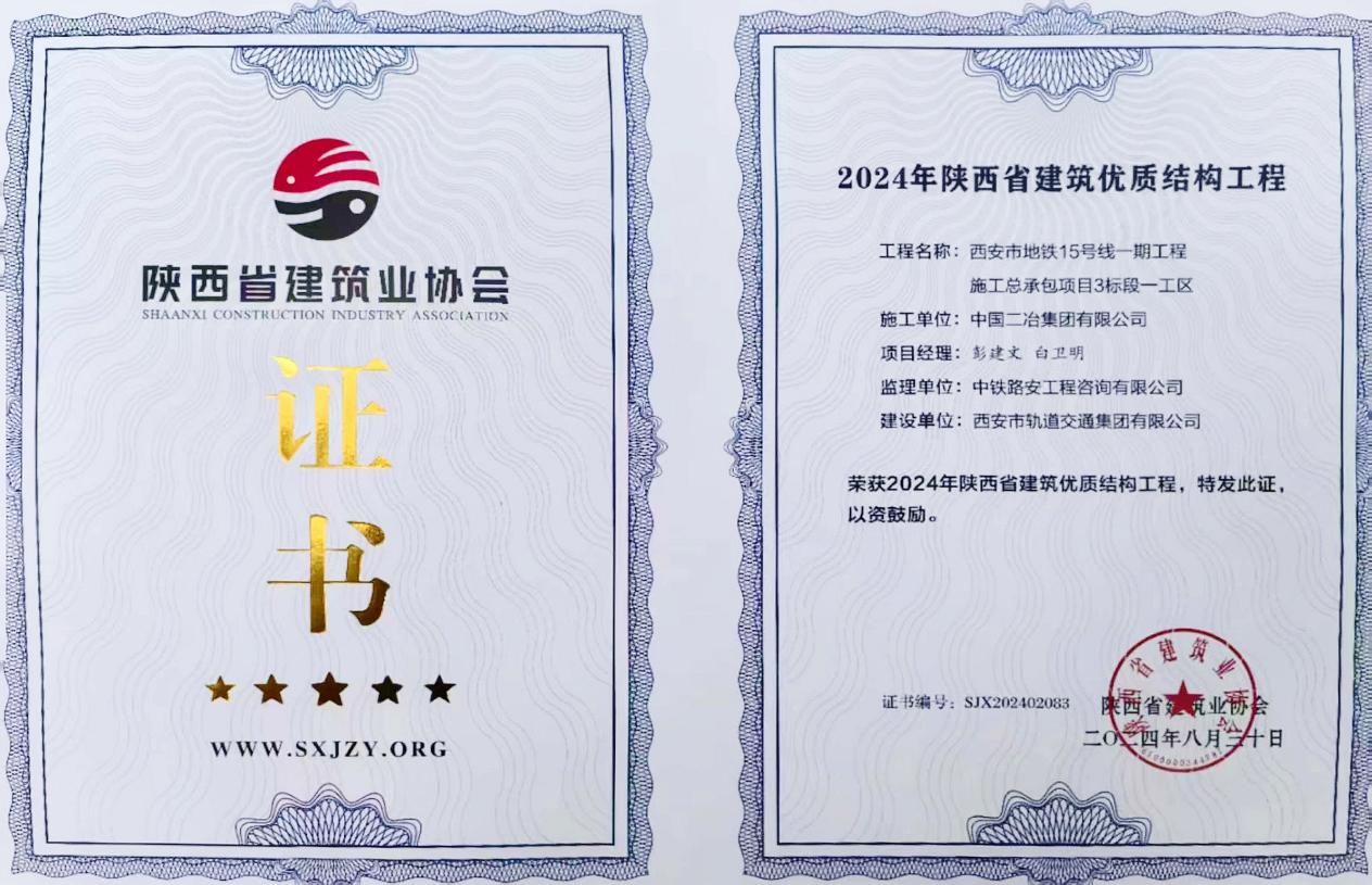 10月9日,由中国二冶承建的西安市地铁15号线一期工程施工总承包项目3标段一工区项目荣获2024年陕西省建筑优质结构工程奖。