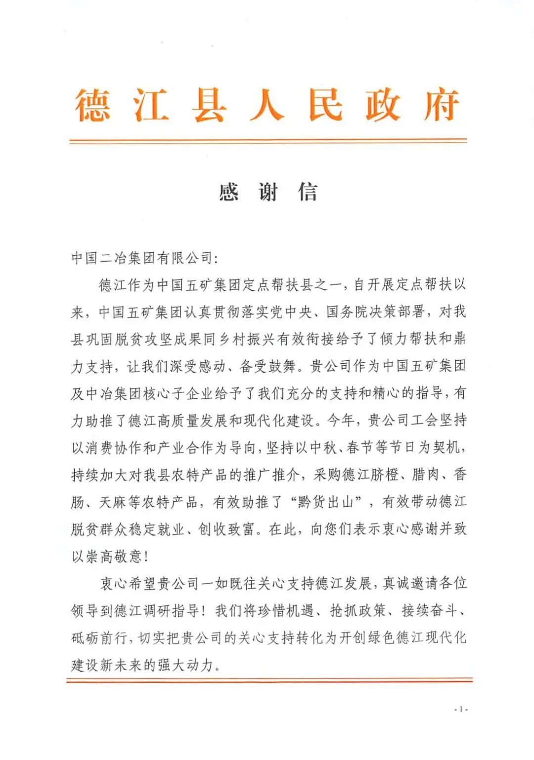 1月20日,中国二冶收到贵州省铜仁市德江县人民政府感谢信,对中国二冶在助推“黔货出山”,带动德江脱贫群众稳定就业、创收致富方面作出的贡献表示感谢。