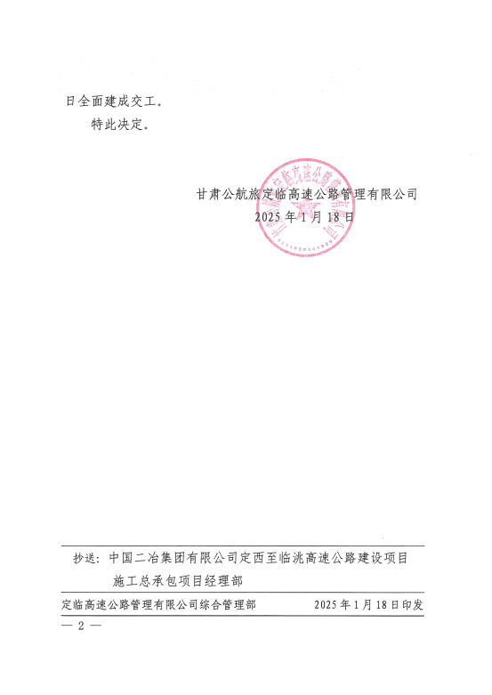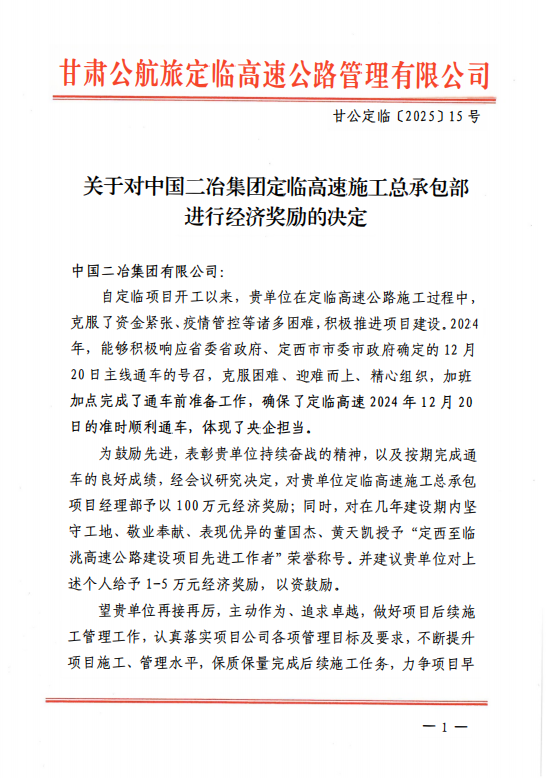 奖励决定指出:自定临项目开工以来,中国二冶集团项目管理团队克服了资金紧张、疫情管控等诸多困难,积极推进项目建设。2024年,能够积极响应省委省政府、定西市委市政府确定的12月20日主线通车的号召,克服困难、迎难而上、精心组织,加班加点完成了通车前准备工作,确保了定临高速在2024年12月20日准时顺利通车,体现了央企担当。