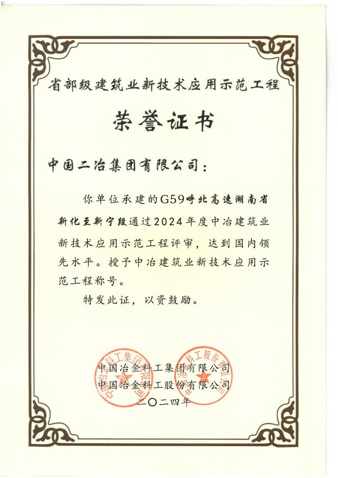 G59呼北高速湖南省新化至新宁段项目在施工过程中注重资源节约与环境保护,取得了良好的经济效益和社会效益。项目成功推广应用了建筑业10项新技术中的7大项22个子项,包括预应力技术、高强钢筋应用技术、高性能钢材应用技术等,同时创新应用了“预制箱梁腹板水平定位支架”等7项已有技术成果。此外,项目还开展了“预制装配式盖板涵工艺研究”等4项自主技术创新,并申请专利9件(其中发明专利1件),展现了显著的技术实力。