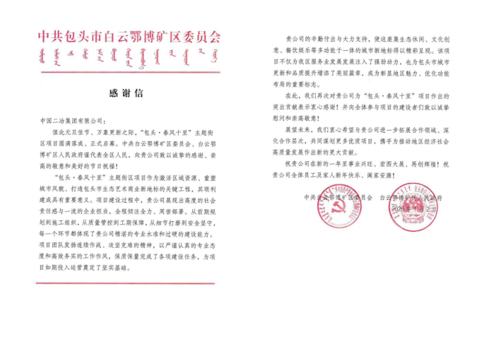 此次感谢及表扬,既是对中国二冶建设成果的高度认可,也是对团队付出的充分信赖。未来,中国二冶将以此为激励,持续深耕包头城市建设领域,以更多优质精品工程赋能地方发展,为推动地区经济社会高质量发展贡献更大央企力量。