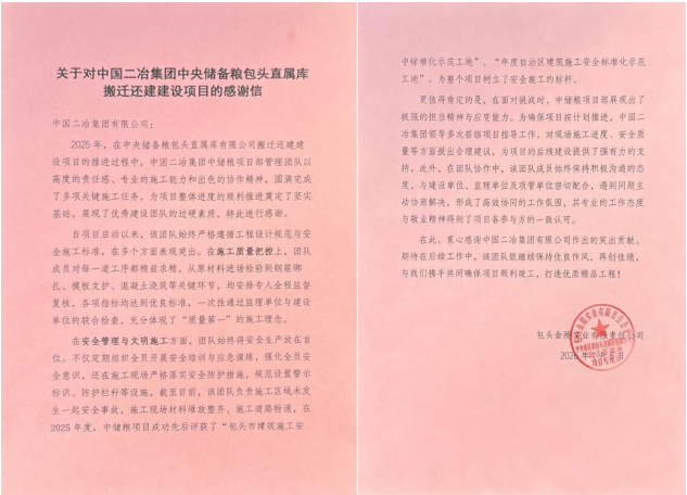 感谢信指出,在2025年项目推进过程中,中国二冶中储粮项目部管理团队以高度的责任感、专业的施工能力和出色的协作精神,圆满完成了多项关键施工任务,为项目整体顺利推进奠定了坚实基础。团队严格遵循设计规范与安全标准,在施工质量上精益求精,从原材料进场到各关键工序均严格把控,一次性通过各项检查,将“质量第一”理念贯穿施工全流程。