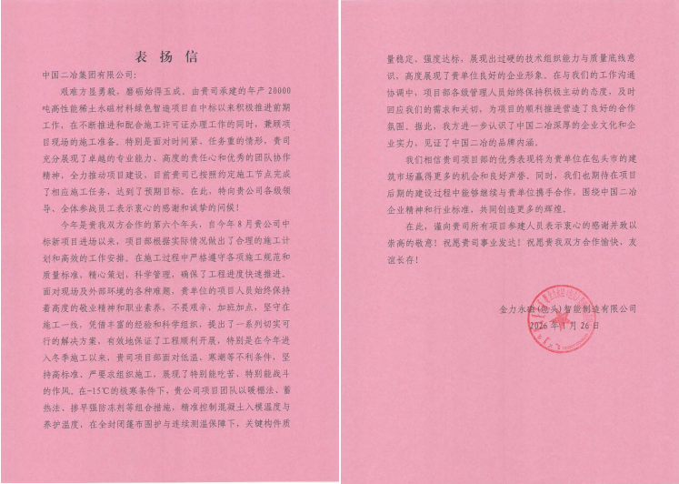信中指出,2025年是双方合作的第六个年头,自贵公司中标新项目进场以来,能够根据实际情况做出合理的施工计划和高效的工作部署,严格遵守各项施工规范和质量标准,精心策划、科学管理,确保了工程进度快速推进。施工过程中,面对现场及外部环境的各种难题,贵单位的项目人员始终保持着高度的敬业精神和职业素养,不畏艰辛、加班加点,坚守施工一线,凭借丰富的经验和科学的组织,制定了一系列切实可行的解决方案。尤其是进入冬季施工以来,项目部突破低温、寒潮等不利条件,坚持高标准、严要求组织施工,积极采用暖棚法、蓄热法、掺早强防冻剂等组合措施,精准控制混凝土入模温度与养护温度,有效保障关键构件质量稳定、强度达标,圆满完成各项施工节点,充分展现了项目团队特别能吃苦、特别能战斗的作风以及过硬的技术组织能力与质量底线意识,在稀土领域树立了良好的口碑和企业形象。