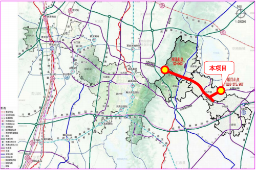 梓州大道南延线(省道424大林至仁寿段)工程位于眉山市天府新区,全长17.284km(含连接线长度)。该工程按一级公路标准双向6车道设计(兼顾城市道路功能),路基宽48米,设计速度80km/h,共有桥梁12座,天桥7座,涵洞及通道32道,穿龙泉山脉隧道1处(4000米),互通立交1处。主要建设项目包括道路工程、桥梁工程、交安工程及相关附属配套设施。